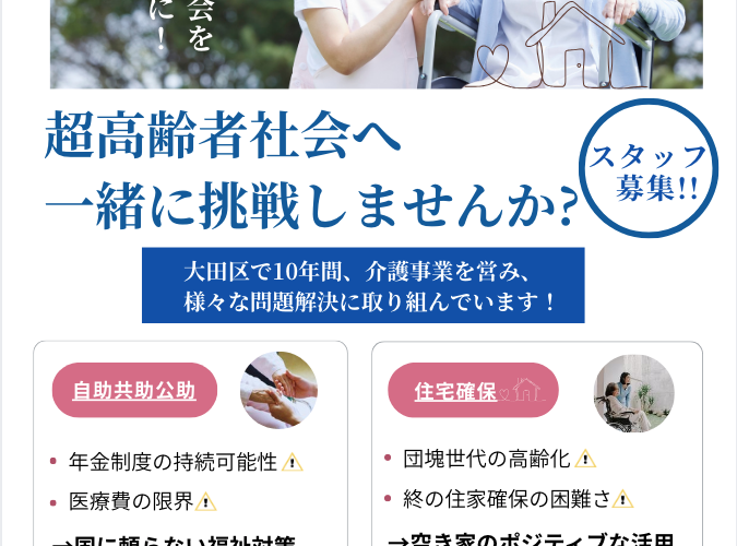 【スタッフ募集!】超高齢者社会へ一緒に挑戦しませんか?! 2026.04.23 [募集職種] ・ケアマネージャー ・介護福祉士 ・福祉用具専門相談員 Tweet Share RSS 【空室あり】ハイツ石川102号[蓮沼駅]前の記事